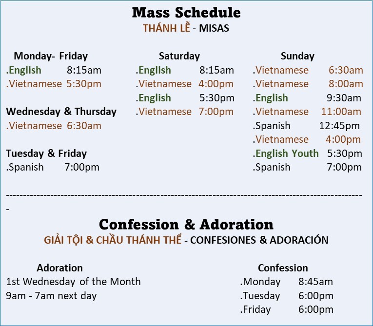 Note: The Church is closed - La Iglesia estrada Cerrada - Nhà Thờ đóng cửa: 10:00 am - 4:00 pm Monday - Friday, Lunes - Viernes, Thứ Hai - Thứ Sáu